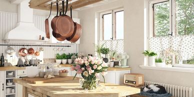Dans une cuisine hygge, on tamise l'éclairage en ajoutant des voilages en lin aux fenêtres, les couleurs sont douces et naturelles. Les plantes vertes donnent un aspect reposant et une touche de couleur. On mise sur le désencombrement et la sobriété.