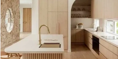 La cuisine Beach House nous rappelle le bord de la mer. Inspiré du style anglais, y ajoutant des accents tropicaux, ce style rassemble des éléments à saveur nautique. Elle est ouverte sur les autres pièces, lumineuse et éclairée.